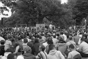 Crowd watching stage. On stage: Pete Seeger (sitting), Hedy West with banjo, Almeda Riddle with child. Peter Yarrow (in sunglasses) and Jean Ritchie (in white hairband) can be seen offstage to the right.